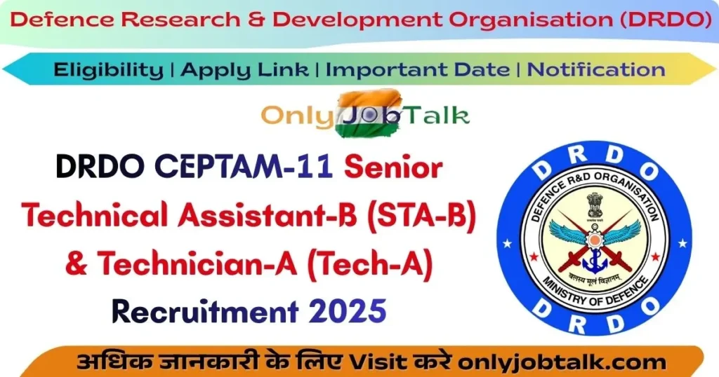 рд░рдХреНрд╖рд╛ рдЕрдиреБрд╕рдВрдзрд╛рди рдПрд╡рдВ рд╡рд┐рдХрд╛рд╕ рд╕рдВрдЧрдарди (DRDO) рдиреЗ Defence Research & Development Organisation (DRDO) Center for Personnel Talent Management CEPTAM 11 Recruitment┬аOfficial┬аNotification рдХреЗ рд▓рд┐рдП рдиреЛрдЯрд┐рдлрд┐рдХреЗрд╢рди рдЬрд╛рд░реА рдХрд░ рджрд┐рдпрд╛ рд╣реИред DRDO CEPTAM-11 Senior Technical Assistant-B (STA-B) & Technician-A (Tech-A) Recruitment 2025 рдкрд░реАрдХреНрд╖рд╛ рдХреЗ рд▓рд┐рдП рдпреЛрдЧреНрдп рдФрд░ рдЗрдЪреНрдЫреБрдХ рдЙрдореНрдореАрджрд╡рд╛рд░ 11 рджрд┐рд╕рдВрдмрд░ 2025 рд╕реЗ 01 рдЬрдирд╡рд░реА 2026 рддрдХ рдСрдирд▓рд╛рдЗрди рдЖрд╡реЗрджрди рдХрд░ рд╕рдХрддреЗ рд╣реИред┬ардЗрд╕ рднрд░реНрддреА рдореЗрдВ рдСрдирд▓рд╛рдЗрди рдЖрд╡реЗрджрди рдХрд░рдиреЗ рдХреЗ рд▓рд┐рдП рдЕрднреНрдпрд░реНрдерд┐рдпреЛрдВ рдХреЛ рдСрдирд▓рд╛рдЗрди рдХреЗ рдорд╛рдзреНрдпрдо рд╕реЗ Defence Research & Development Organisation (DRDO) рдХреА рдСрдлрд┐рд╢рд┐рдпрд▓ рд╡реЗрдмрд╕рд╛рдЗрдЯ рдпрд╛ рдирд┐рдЪреЗ рджрд┐рдП рдЧрдП рд▓рд┐рдВрдХ рдкрд░ рдЬрд╛рдХрд░ рдЖрд╡реЗрджрди рдХрд░рдирд╛ рд╣реЛрдЧрд╛ред рдЙрдкрд░реЛрдХреНрдд рдкрд░реАрдХреНрд╖рд╛ рд╣реЗрддреБ рдЖрд╡реЗрджрди рдХреЗрд╡рд▓ рдСрдирд▓рд╛рдЗрди рд╣реА рд╕реНрд╡реАрдХрд╛рд░ рдХрд┐рдП рдЬрд╛рдПрдВрдЧреЗред рдЕрдиреНрдп рдХрд┐рд╕реА рднреА рдкреНрд░рдХрд╛рд░ рд╕реЗ рднреЗрдЬреЗ рдЧрдП рдЖрд╡реЗрджрди-рдкрддреНрд░ рд╕реНрд╡реАрдХрд╛рд░ рдирд╣реАрдВ рдХрд┐рдП рдЬрд╛рдПрдВрдЧреЗред