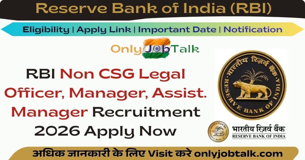 рд░рд┐рдЬрд░реНрд╡ рдмреИрдВрдХ рдСрдл рдЗрдВрдбрд┐рдпрд╛ (RBI) рдиреЗ RBI Non CSG Legal Officer, Manager, Assistant Manager Recruitment 2026 рдХреЗ рд▓рд┐рдП рдиреЛрдЯрд┐рдлрд┐рдХреЗрд╢рди рдЬрд╛рд░реА рдХрд░ рджрд┐рдпрд╛ рд╣реИред Non CSG Legal Officer, Manager & Assistant Manager Recruitment 2026 Notification рдкрд░реАрдХреНрд╖рд╛ рдХреЗ рд▓рд┐рдП рдпреЛрдЧреНрдп рдФрд░ рдЗрдЪреНрдЫреБрдХ рдЙрдореНрдореАрджрд╡рд╛рд░ 06 рдлрд░рд╡рд░реА рд╕реЗ 26 рдлрд░рд╡рд░реА 2026 рддрдХ рдСрдирд▓рд╛рдЗрди рдЖрд╡реЗрджрди рдХрд░ рд╕рдХрддреЗ рд╣реИред┬ардЗрд╕ рднрд░реНрддреА рдореЗрдВ рдСрдирд▓рд╛рдЗрди рдЖрд╡реЗрджрди рдХрд░рдиреЗ рдХреЗ рд▓рд┐рдП рдЕрднреНрдпрд░реНрдерд┐рдпреЛрдВ рдХреЛ рдСрдирд▓рд╛рдЗрди рдХреЗ рдорд╛рдзреНрдпрдо рд╕реЗ Reserve Bank of India (RBI) рдХреА рдСрдлрд┐рд╢рд┐рдпрд▓ рд╡реЗрдмрд╕рд╛рдЗрдЯ рдпрд╛ рдирд┐рдЪреЗ рджрд┐рдП рдЧрдП рд▓рд┐рдВрдХ рдкрд░ рдЬрд╛рдХрд░ рдЖрд╡реЗрджрди рдХрд░рдирд╛ рд╣реЛрдЧрд╛ред рдЙрдкрд░реЛрдХреНрдд рдкрд░реАрдХреНрд╖рд╛ рд╣реЗрддреБ рдЖрд╡реЗрджрди рдХреЗрд╡рд▓ рдСрдирд▓рд╛рдЗрди рд╣реА рд╕реНрд╡реАрдХрд╛рд░ рдХрд┐рдП рдЬрд╛рдПрдВрдЧреЗред рдЕрдиреНрдп рдХрд┐рд╕реА рднреА рдкреНрд░рдХрд╛рд░ рд╕реЗ рднреЗрдЬреЗ рдЧрдП рдЖрд╡реЗрджрди-рдкрддреНрд░ рд╕реНрд╡реАрдХрд╛рд░ рдирд╣реАрдВ рдХрд┐рдП рдЬрд╛рдПрдВрдЧреЗред