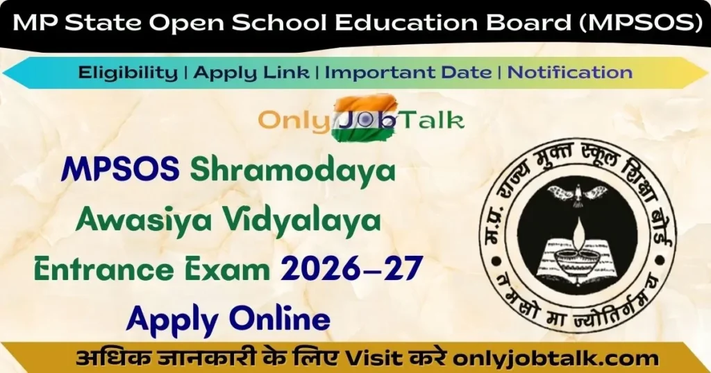 मध्य प्रदेश राज्य मुक्त विद्यालय शिक्षा बोर्ड (MPSOS) ने MP Shramodaya School Entrance Test 2025-26 के लिए नोटिफिकेशन जारी कर दिया है। यह योजना मध्य प्रदेश के पंजीकृत निर्माण श्रमिकों के बच्चों को कक्षा 6, 7, 8 और 9 में गुणवत्तापूर्ण आवासीय शिक्षा प्रदान करने के उद्देश्य से शुरू की गई है। Shramodaya Awasiya Vidyalaya Admission 2026–27 Notification परीक्षा के लिए योग्य और इच्छुक उम्मीदवार 24 दिसंबर 2025 से 20 जनवरी 2026 तक ऑनलाइन आवेदन कर सकते है।